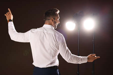 Motivational speaker with headset performing on stage, back view