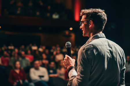 Young businessman giving a motivational speech during a conference in a modern auditorium, inspiring the audience with his engaging presentation