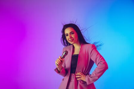 Caucasian female singer portrait isolated on gradient studio background in neon light. Beautiful female model in pink wear with microphone. Concept of human emotions, facial expression, ad, music, art.