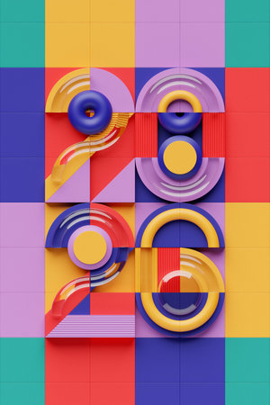 The letters made from multicolored tubes: '2026' with 3D numbers on a colorful background with New Year celebration balls, suitable for flyers, posters, signs for business design, brochures, cards, banners, and postcards. 3D illustration