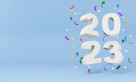 New year 2023 concept with a block of numbers and colorful confetti. 3D render illustration.