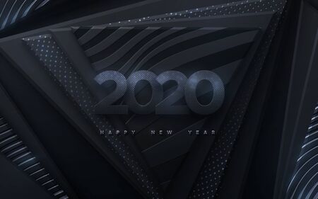 Happy New 2020 Year. Vector holiday illustration. Paper 3d numbers with silver glitters on black abstract background. Festive banner. Decoration element for poster or cover design