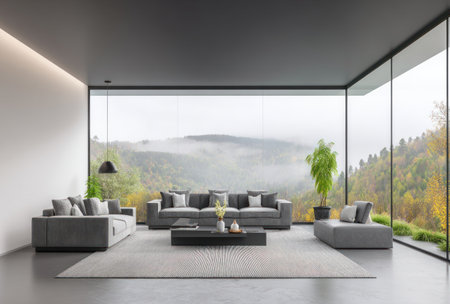 Modern living room with large windows, grey sofas, and a beautiful view of a misty forest