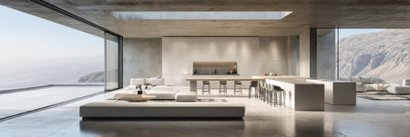 Modern living room with panoramic views, minimalist design, and cozy furniture, highlighting contemporary elegance