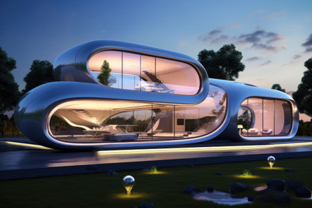 A modern house with a unique curved roof and walls made entirely of glass, A futuristic home with smart home features, AI Generated