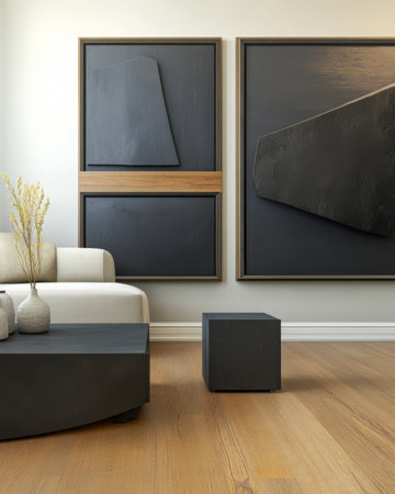 A stylish living room showcases minimalistic decor with black abstract wall art and a light wooden floor. A sofa coffee table and decorative plant enhance the contemporary atmosphere.