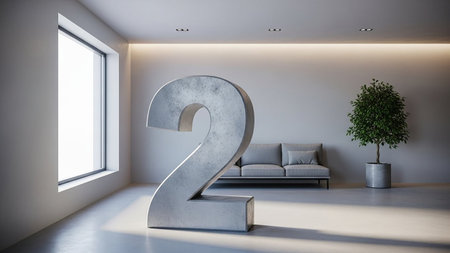 A large white number two sculpture in a minimalist living room with a couch and potted plant