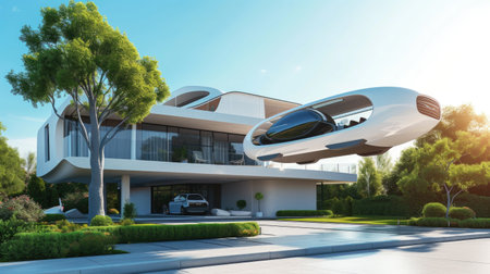 Next-Gen Commute: Futuristic Personal Aircraft Hovering Above Modern Home