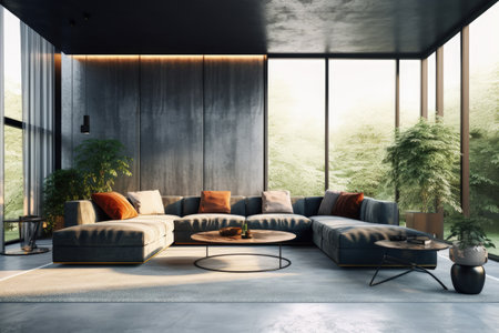 Living room decor, home interior design . Modern Minimalist style with Large Windows decorated with Concrete and Glass material . Generative AI AIG26.
