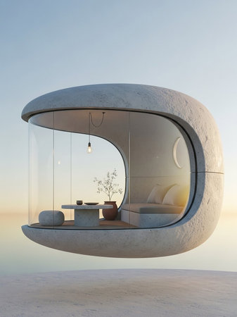 A futuristic pod-like dwelling with curved glass walls offers a minimalist interior and panoramic views of the sky.