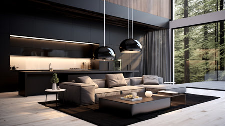 Luxurious open plan livingroom and kitchen in black and dark grey, modern style living room and kitchen interior design. generative ai