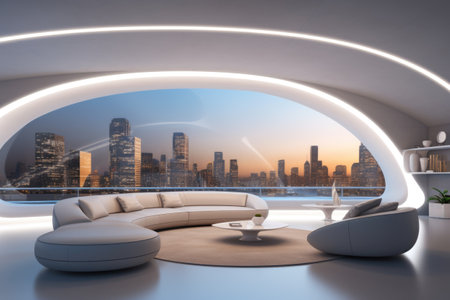 Futuristic light interior of oval room with white long oval sofas against urban evening landscape.