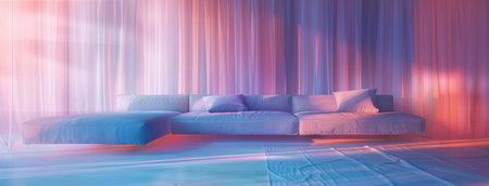 Stylish modern living room features neon purple lighting and sleek design with a fuzzy rug Great for interior design inspiration or futuristic concepts.