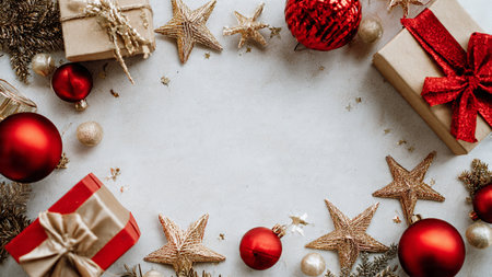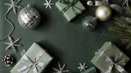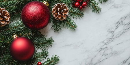 A top-down shot of a Christmas flat lay featuring gift boxes, fir branches, and shiny balls, with plenty of room for your own holiday message.