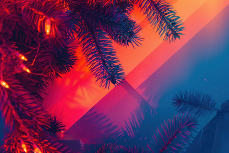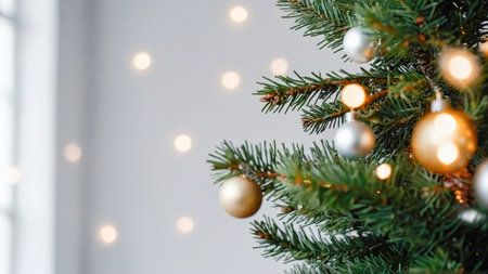 Christmas tree branches adorned with ornaments, colorful decorations, and twinkling lights, festive holiday scene.