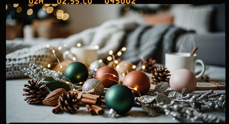A cozy holiday scene featuring decorative ornaments, pine cones, and twinkling lights on a soft surface, with a blurred background of a warm living space