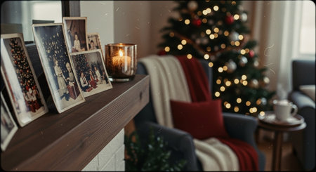 A cozy living room decorated for the holidays, featuring a Christmas tree with lights, a table with a camera, ornaments, and a mug