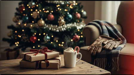 Cup of coffee on table in cozy living room with Christmas tree and decorations
