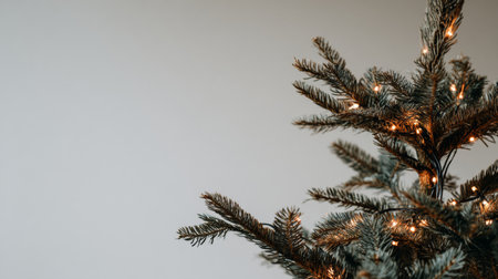 This image captures a beautifully decorated Christmas tree adorned with warm fairy lights, set against a neutral background, perfect for winter season themes.