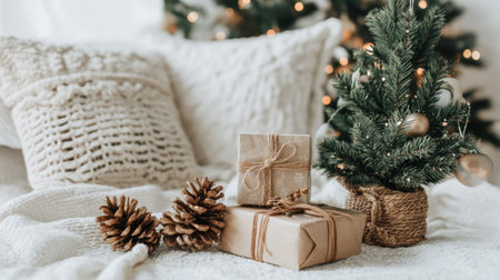A cozy holiday scene featuring wrapped gifts, pine cones, and a small Christmas tree, all arranged on a soft blanket, creating a warm and festive atmosphere.