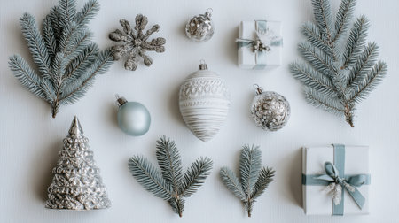 A beautifully arranged festive composition featuring silver ornaments, pine branches, and elegant gift boxes on a soft backdrop, perfect for enhancing holiday themes and moods.