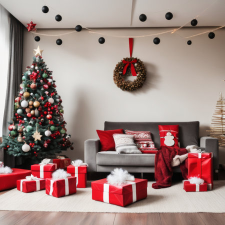 a beautifully decorated living room with a Christmas tree, presents, and garlands.