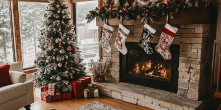 A cozy fireplace scene with a Christmas tree adorned with handmade decorations and stockings hung with care