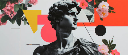 Collage features a black-and-white statue amidst geometric elements and floral accents