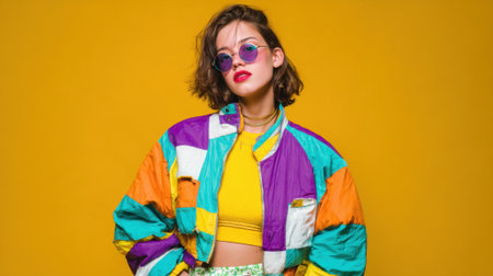 A young woman poses confidently wearing a colorful jacket and stylish sunglasses with a bold yellow wall behind.