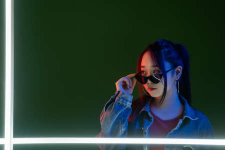 Cyberpunk portrait. Millennial nightlife. Advertising background. Content promotion. Fashionable gorgeous woman in neon LED light isolated on dark copy space.