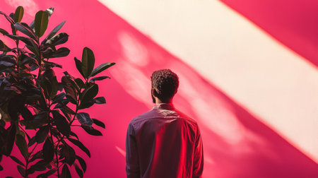 Minimalist photo of a man standing near a vibrant pink wall with shadows and lush green plants, creating a stylish and modern composition.