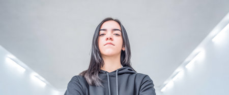 A young woman stands confidently in a sleek, modern corridor, showcasing her bold expression and stylish outfit, illuminated by bright overhead lights.
