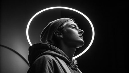 Pensive and reflective the figures face is encircled by an electric white neon outline radiating softly against the enveloping darkness creating a halo effect..