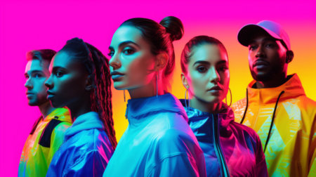 A diverse group of teenagers standing against a vibrant, multicolored background, expressing unity and youth. Perfect for concepts related to friendship, diversity, and modern fashion.