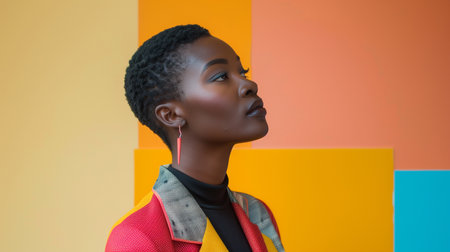 A striking portrait of a woman is set against an engaging backdrop of bold colors and abstract shapes. The artwork combines modern elements with vibrant details.