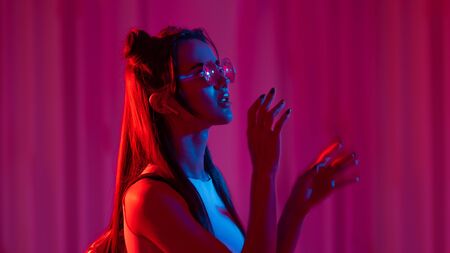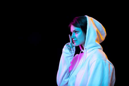Side view of young beautiful girl isolated over dark background in neon light.