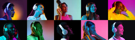 Collage of portraits of an ethnically diverse people in white headphones isolated over multicolored background.