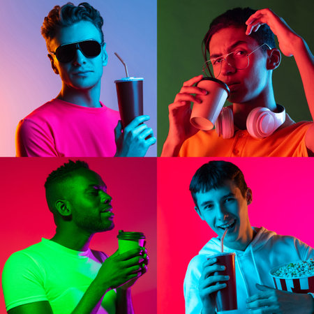 Portraits of group of multiethnic young men isolated on multicolored background. Concept of emotions, facial expressions. Collage