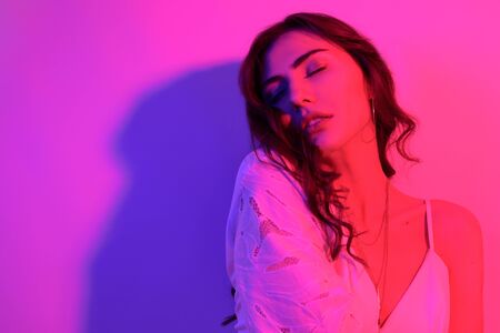 Brunette with long curled hair dancing in neon. A girl with professional makeup in red and blue light posing. Sexy model in a white dress at a party.