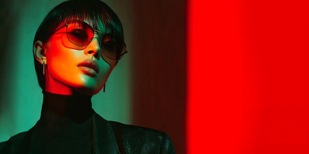 Woman wearing bold sunglasses, showing a confident look with vibrant makeup and large hoop earrings. The Confident expression and colored neon lighting create a striking fashion statement.