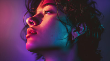 A captivating portrait captured with a double reflection enveloped in soft neon lavender hues. The blended images produce a dreamlike quality while vibrant highlights dance around.