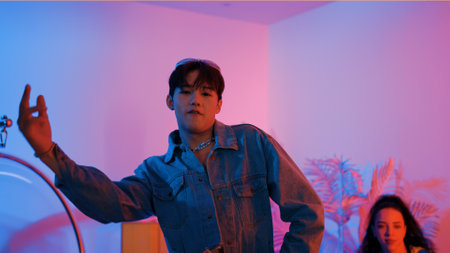 Skilled asian dancer moving to modern music while multicultural friend sitting at chair. Professional performer dancing show energetic foot step while hipster team cheering and supporting. Regalement.