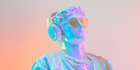 Fluorescent sculpture of Apollo wearing glasses and headphones on a pastel pink background.