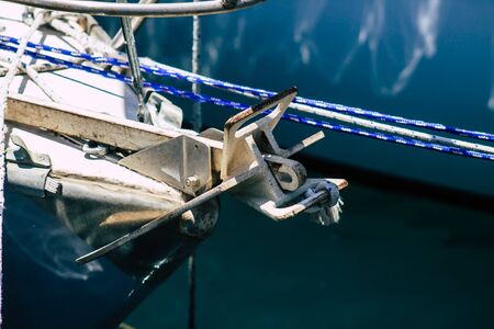 Huge and massive anchor of modern yacht moored in harbor near sea