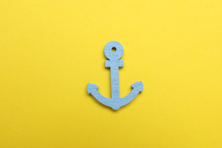 Wooden anchor, steering wheel and lifebuoy on yellow background. Copy space.