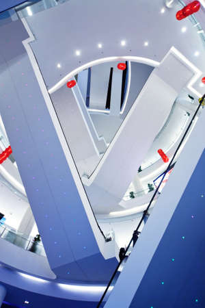 Interior of a modern office building with people walking down the stairs and escalators