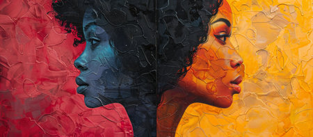 Artistic silhouettes of two human profiles in vibrant colors, showcasing an abstract background filled with yellow, red, and blue hues, creating a striking visual contrast