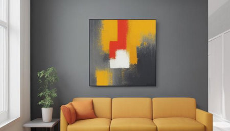 A vibrant art gallery showcasing stunning abstract paintings with a warm and inviting atmosphere. The blurred background creates a captivating depth effect.