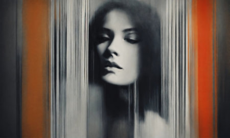 A striking portrait of a woman is set against an engaging backdrop of bold colors and abstract shapes. The artwork combines modern elements with vibrant details.