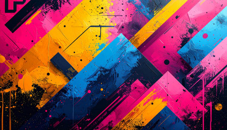 A high energy explosion of overlapping shapes and textures, blending bright primary colors with expressive brushstrokes for a raw, artistic feel.